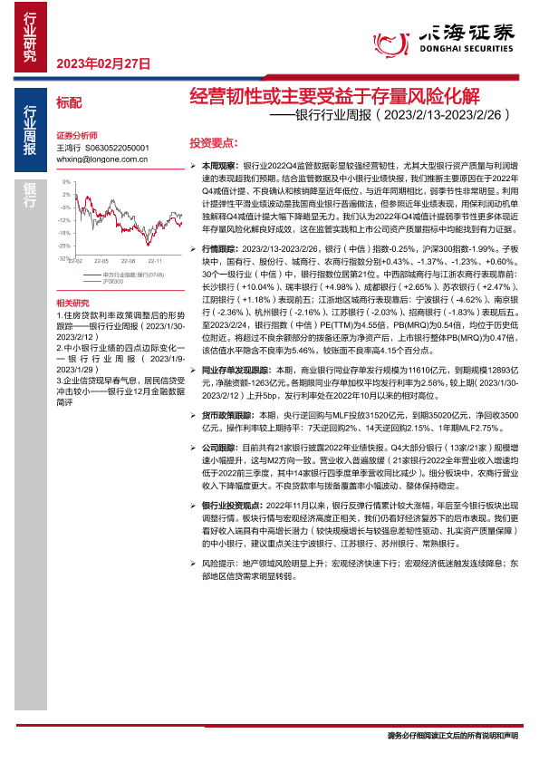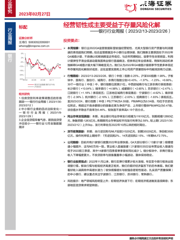 【东海证券】【20230227】银行行业周报:经营韧性或主要受益于存量风险化解-15页