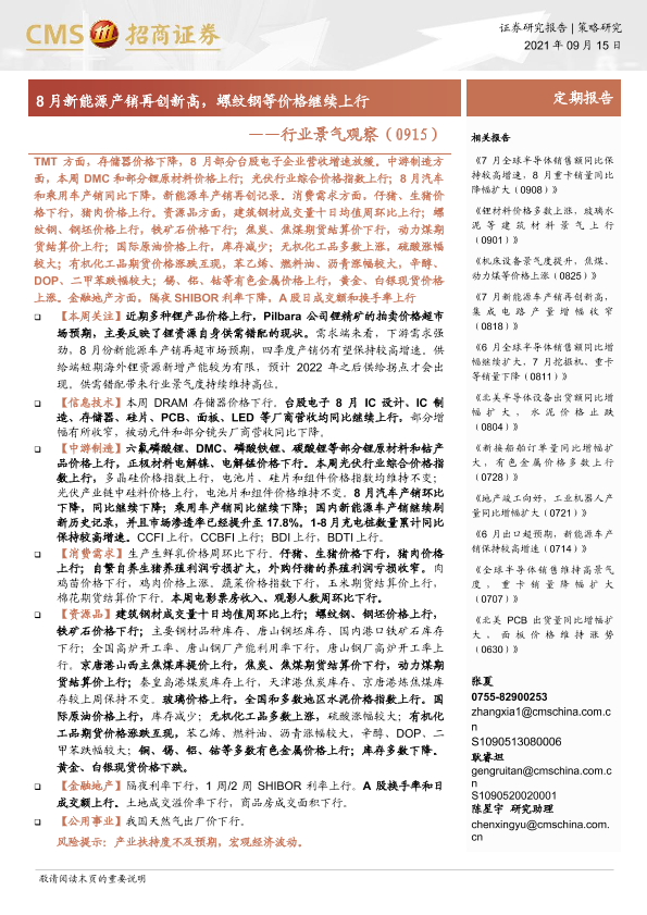 【海通证券】【20210915】行业景气观察:8月新能源产销再创新高,螺纹钢等价格继续上行-32页