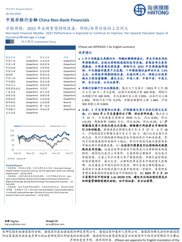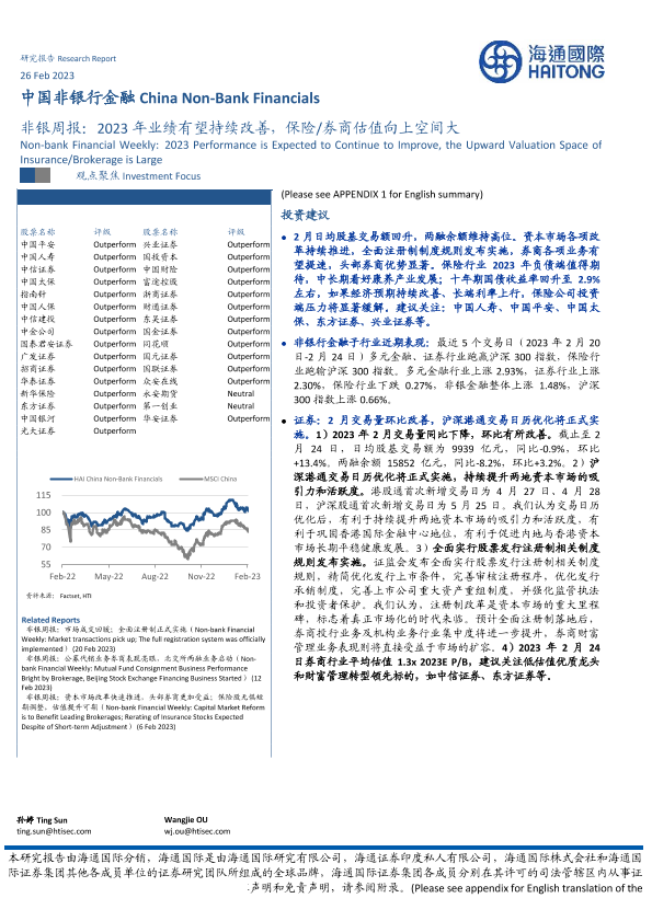 【海通证券】【20230226】非银行业周报:2023年业绩有望持续改善,保险/券商估值向上空间大-20页