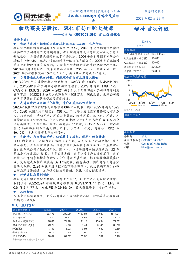 【国元证券】【20230228】首次覆盖报告:收购薇美姿股权,深化布局口腔大健康-20页