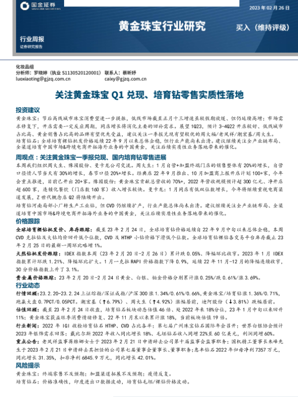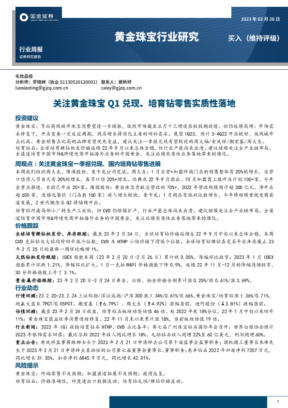 【国金证券】【20230226】黄金珠宝行业周报:关注黄金珠宝Q1兑现、培育钻零售实质性落地-20页
