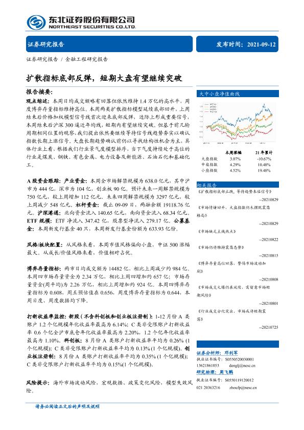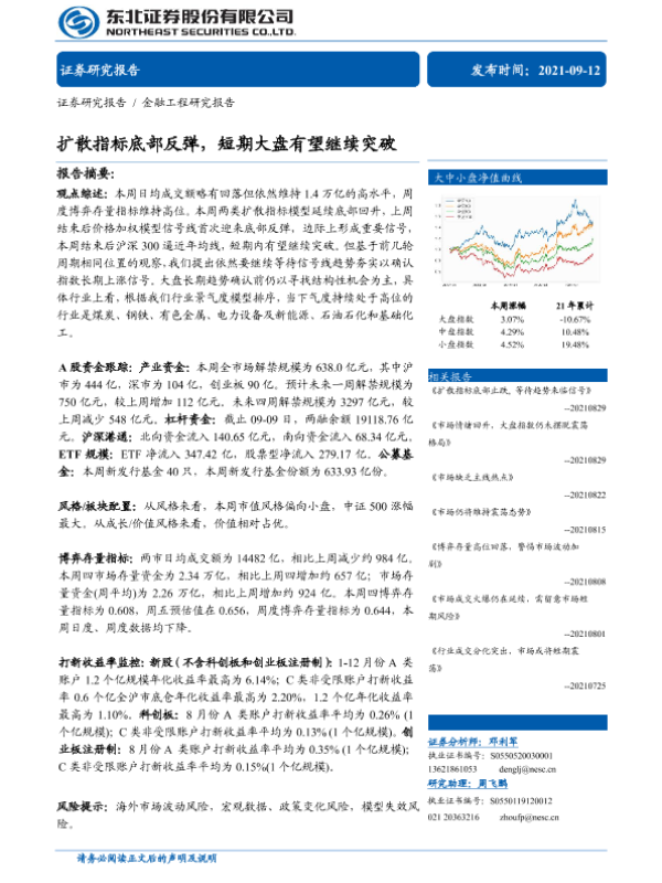 【东北证券】【20210912】金融工程研究报告:扩散指标底部反弹,短期大盘有望继续突破-30页