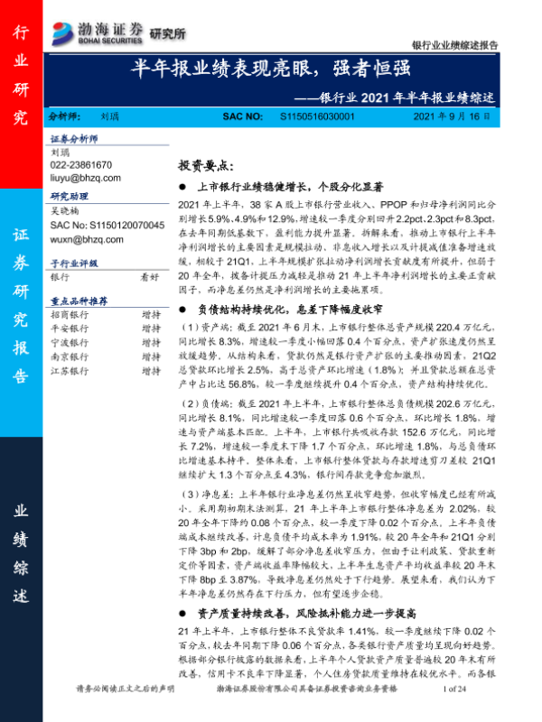 【渤海证券】【20210916】银行业2021年半年报业绩综述:半年报业绩表现亮眼,强者恒强-24页