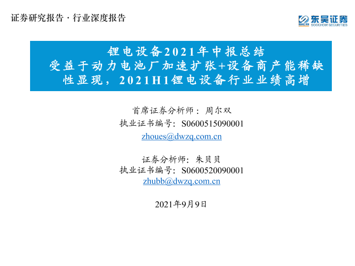【东吴证券】【20210909】锂电设备行业2021年中报总结:受益于动力电池厂加速扩张+设备商产能稀缺性显现,2021 H 1锂电设备行业业绩高增-32页