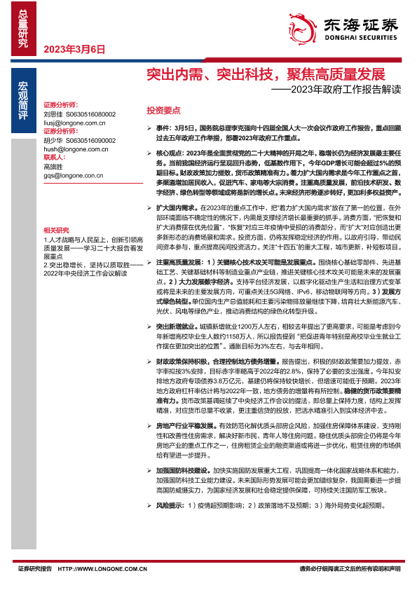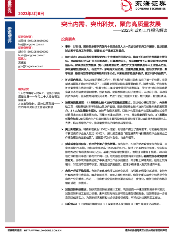 【东海证券】【20230306】2023年政府工作报告解读:突出内需、突出科技,聚焦高质量发展-15页