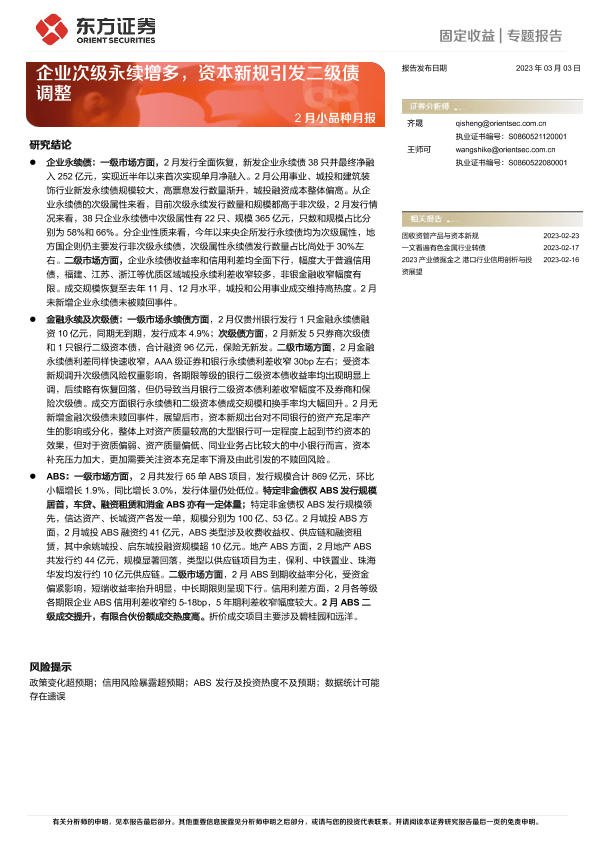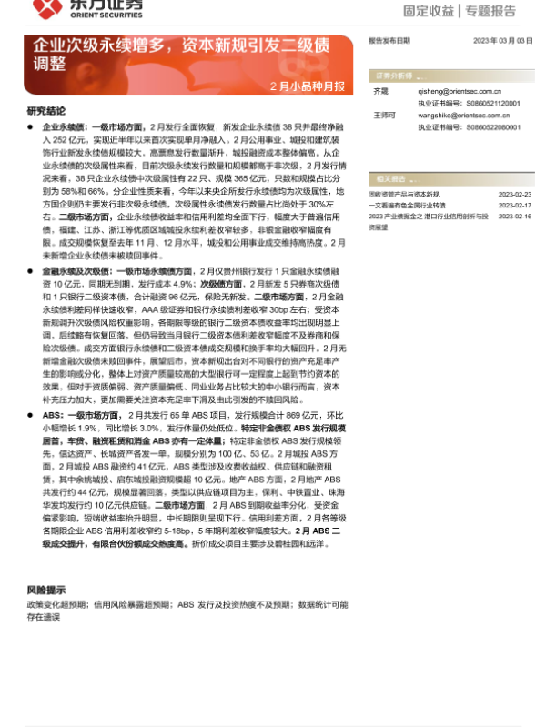 【东方证券】【20230303】2月小品种月报:企业次级永续增多,资本新规引发二级债调整-18页