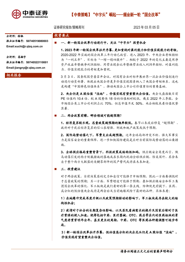 中字头 军工板块 医药行业 证券分析 国企改革