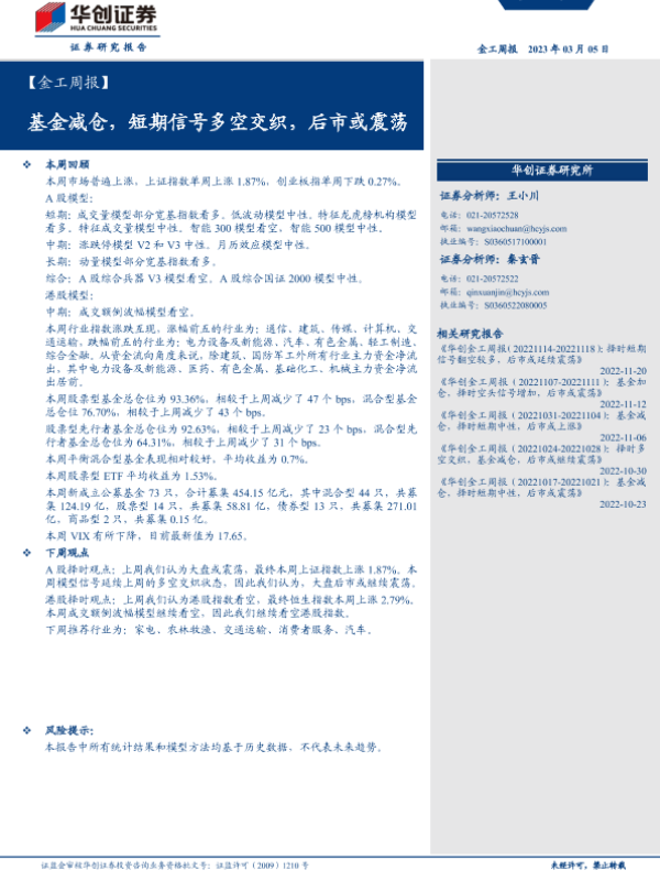 【华创证券】【20230305】【金工周报】基金减仓,短期信号多空交织,后市或震荡-26页