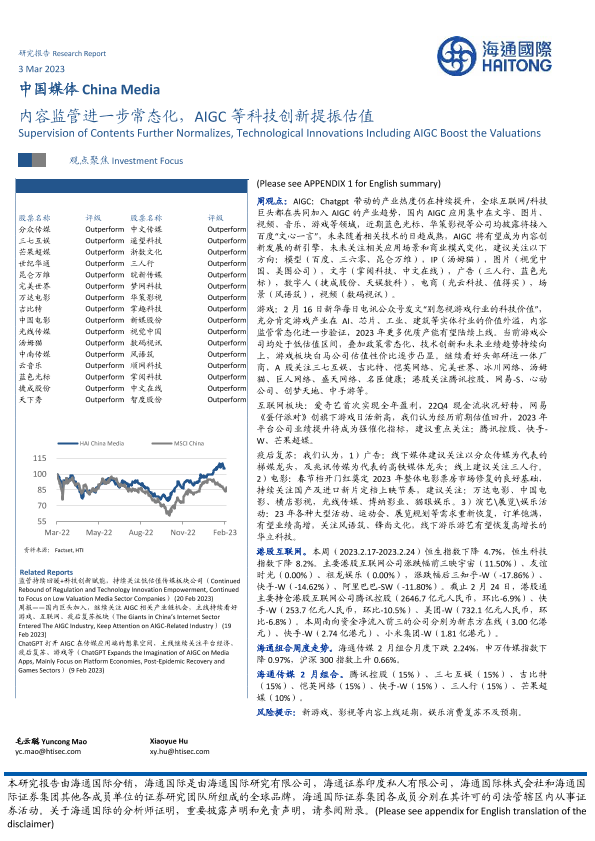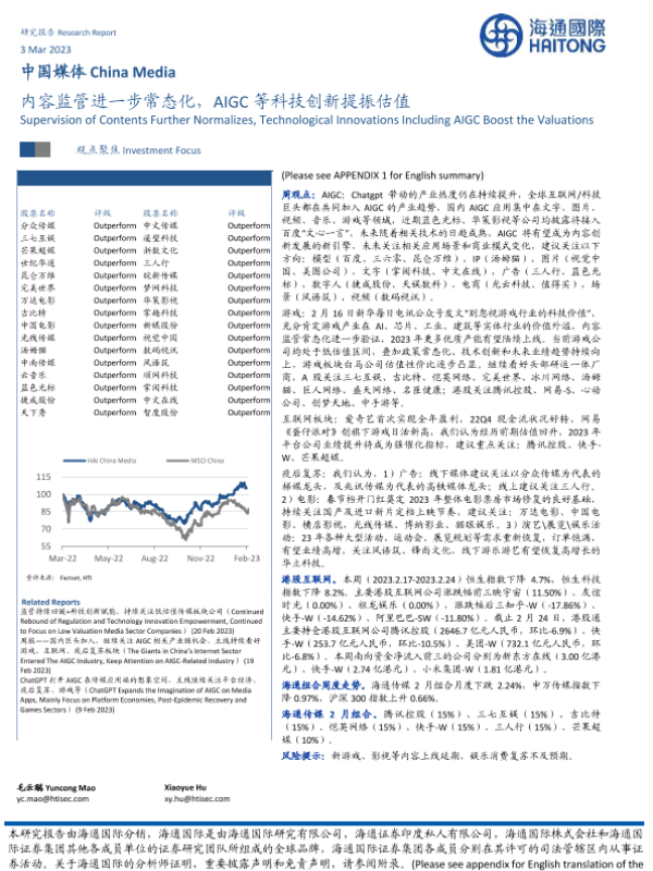 【海通证券】【20230303】中国媒体:内容监管进一步常态化,AIGC等科技创新提振估值-16页