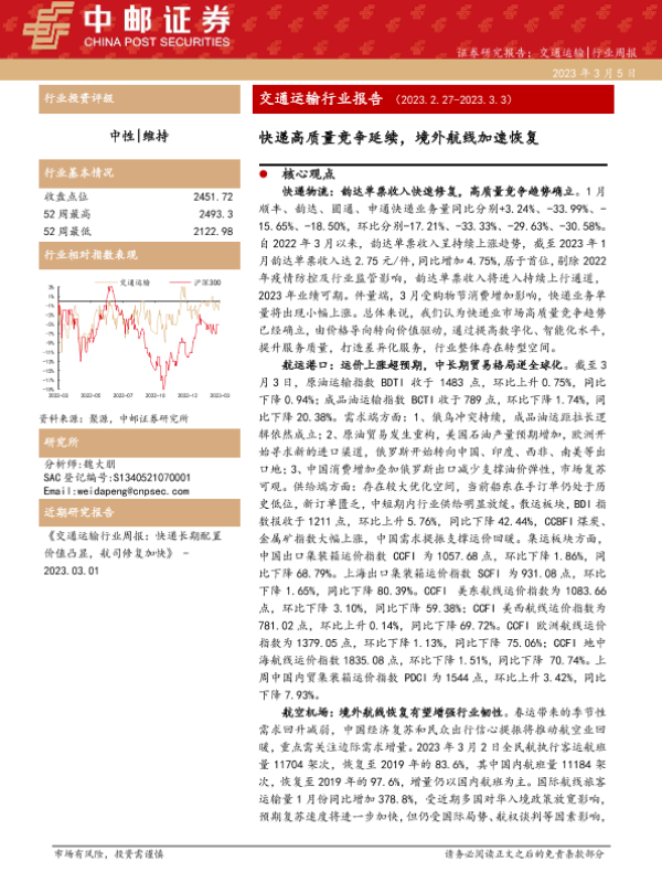 【中邮证券】【20230305】交通运输行业报告:快递高质量竞争延续,境外航线加速恢复-19页