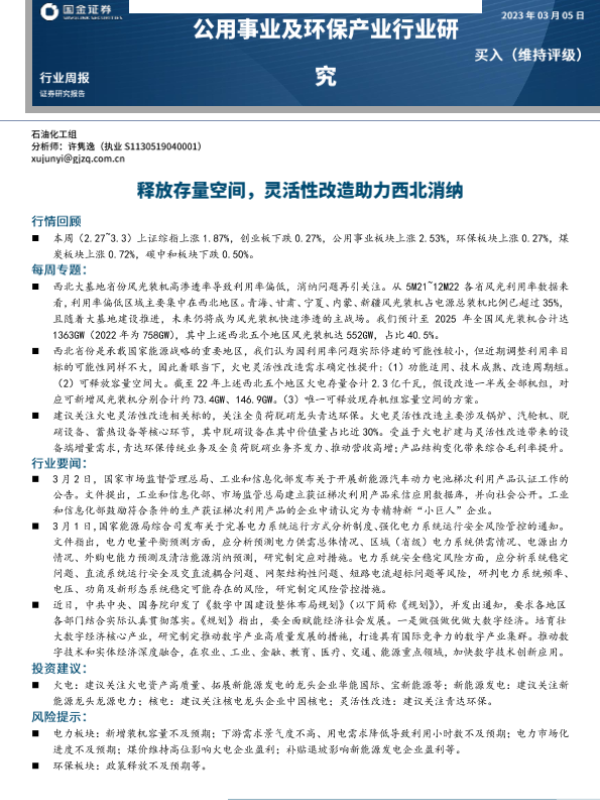 【国金证券】【20230305】公用事业及环保产业行业研究周报:释放存量空间,灵活性改造助力西北消纳-18页