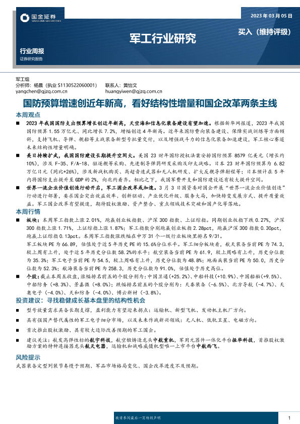 【国金证券】【20230305】军工行业周报:国防预算增速创近年新高,看好结构性增量和国企改革两条主线-15页