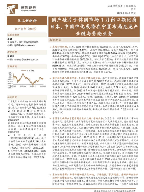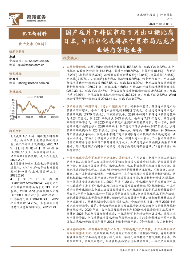 【德邦证券】【20230305】化工新材料行业周报:国产硅片于韩国市场1月出口额比肩日本,中国中化或将在宁夏布局尼龙产业链与芳纶业务-16页