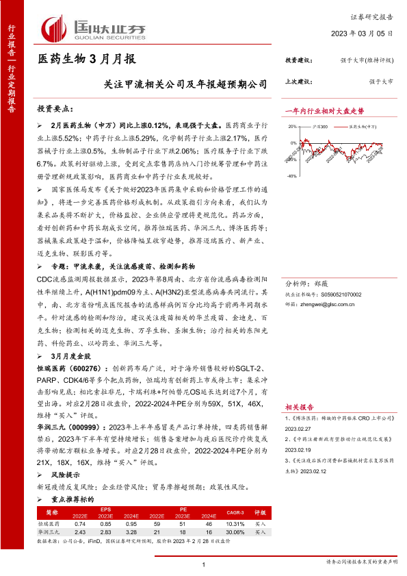 【国联证券】【20230305】医药生物行业3月月报:关注甲流相关公司及年报超预期公司-19页