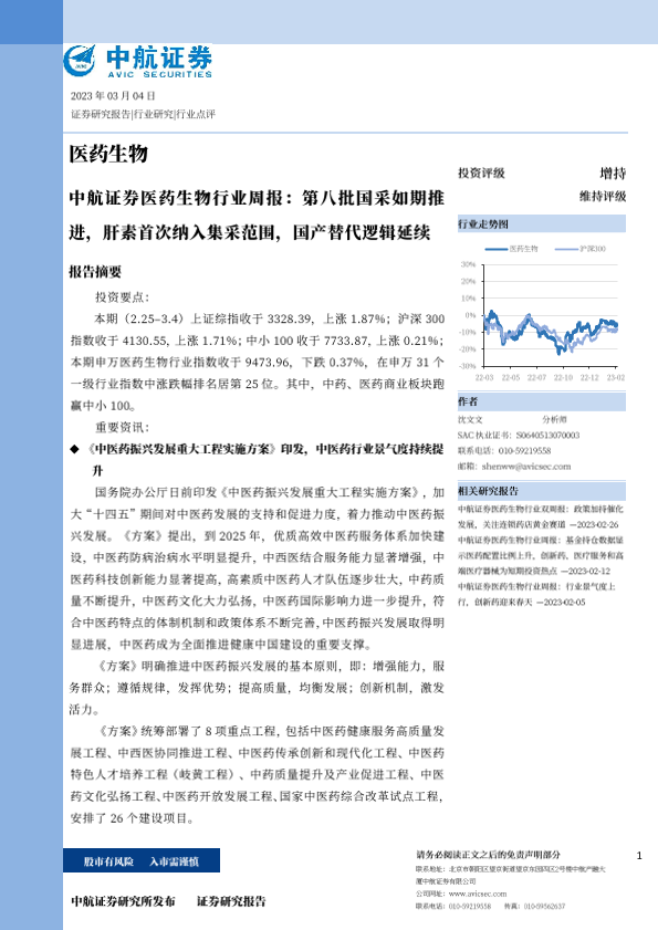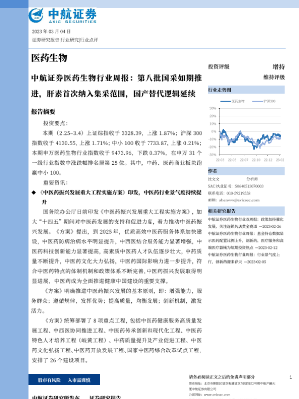 【中航证券】【20230304】医药生物行业周报:第八批国采如期推进,肝素首次纳入集采范围,国产替代逻辑延续-24页