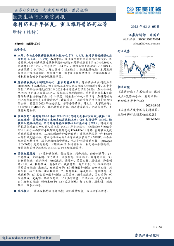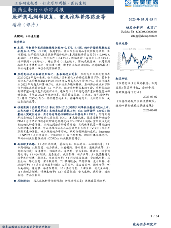 【东吴证券】【20230305】医药生物行业跟踪周报:原料药毛利率恢复,重点推荐普洛药业等-34页