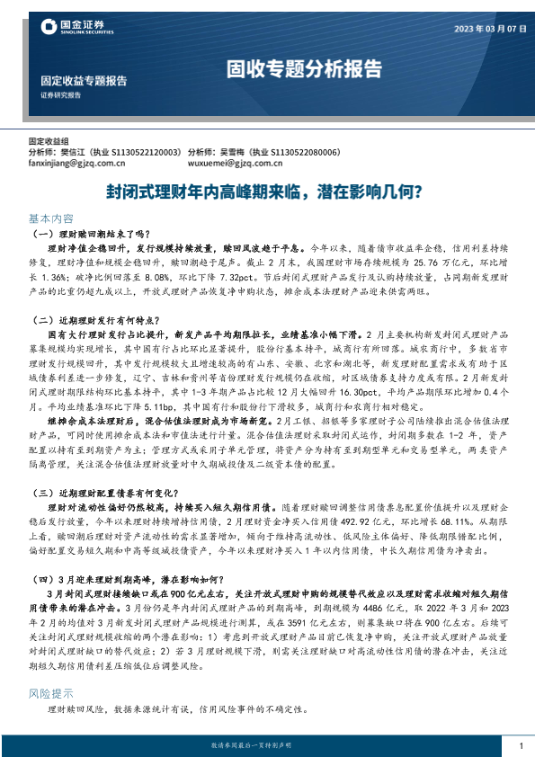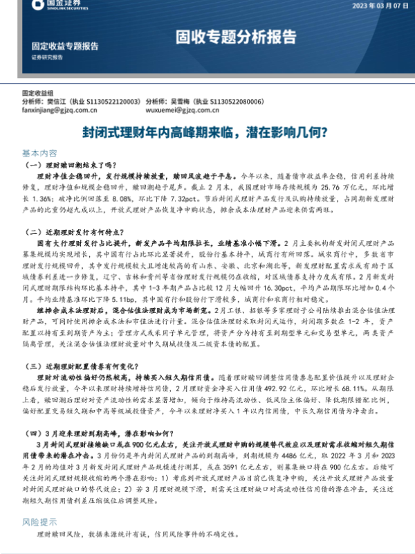 【国金证券】【20230307】固收专题分析报告:封闭式理财年内高峰期来临,潜在影响几何?-16页