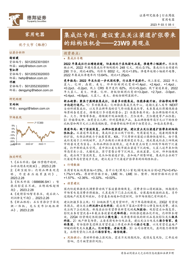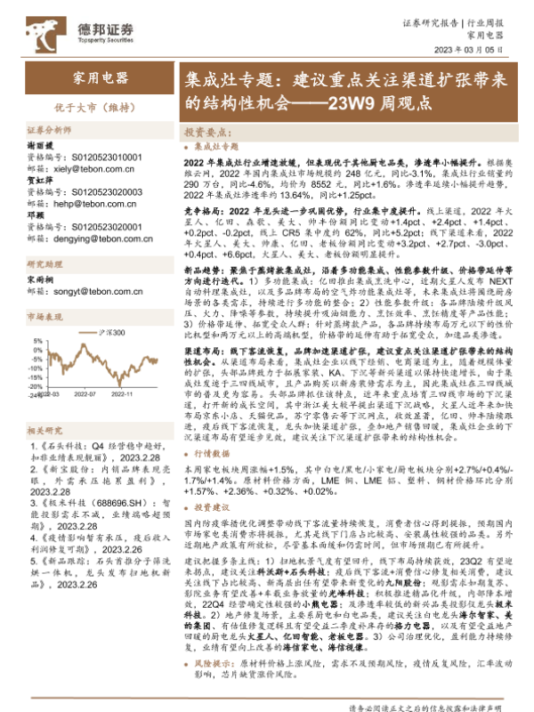 【德邦证券】【20230305】家用电器23W9周观点:集成灶专题:建议重点关注渠道扩张带来的结构性机会-15页
