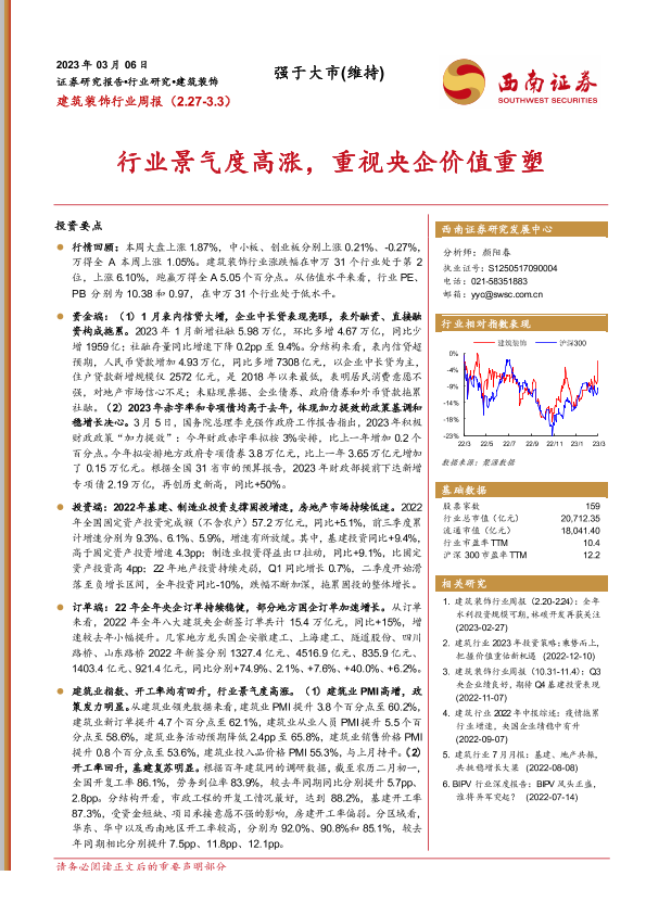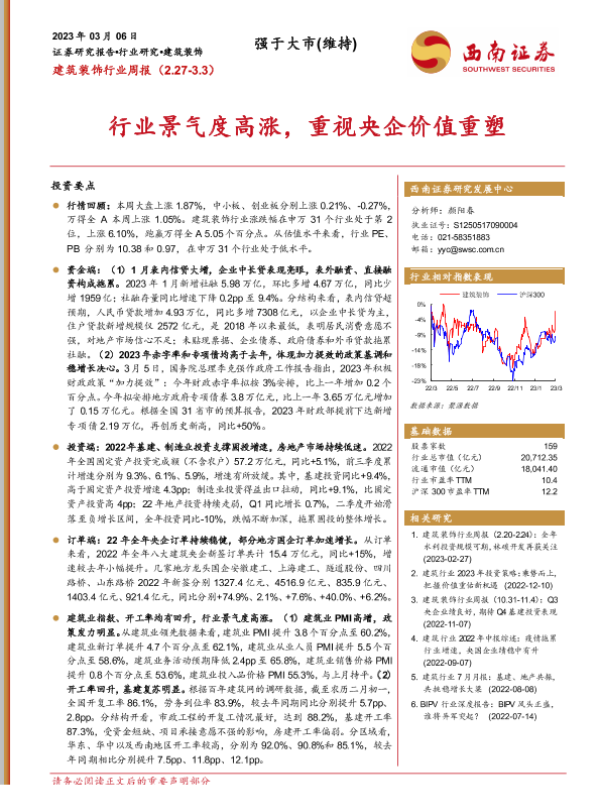 【西南证券】【20230306】建筑装饰行业周报:行业景气度高涨,重视央企价值重塑-15页