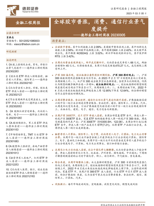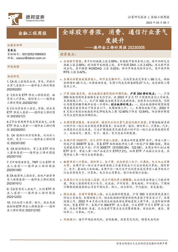 【德邦证券】【20230305】德邦金工择时周报:全球股市普涨,消费、通信行业景气度提升-27页