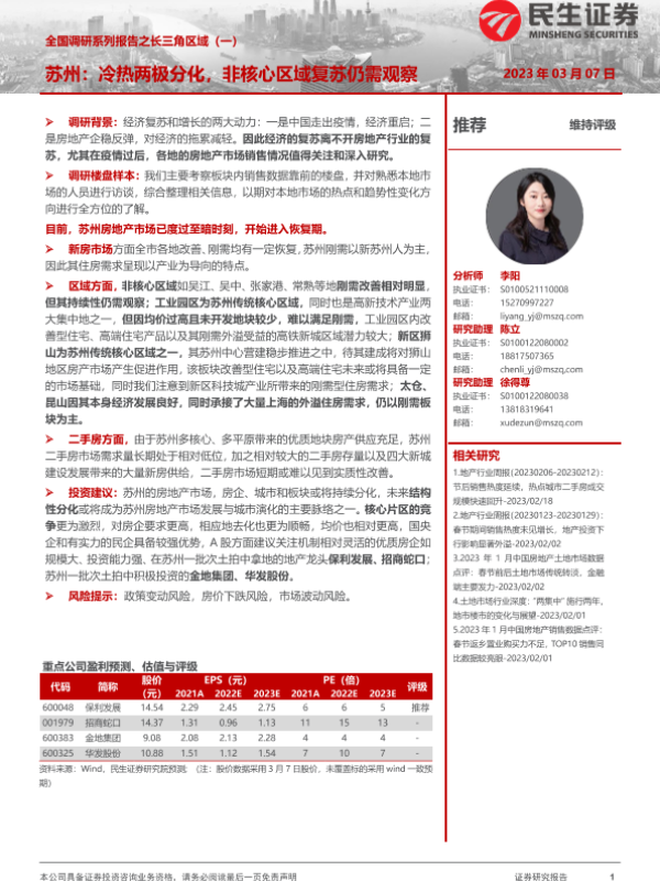 【民生证券】【20230307】房地产行业全国调研系列报告之长三角区域(一):苏州,冷热两极分化,非核心区域复苏仍需观察-17页