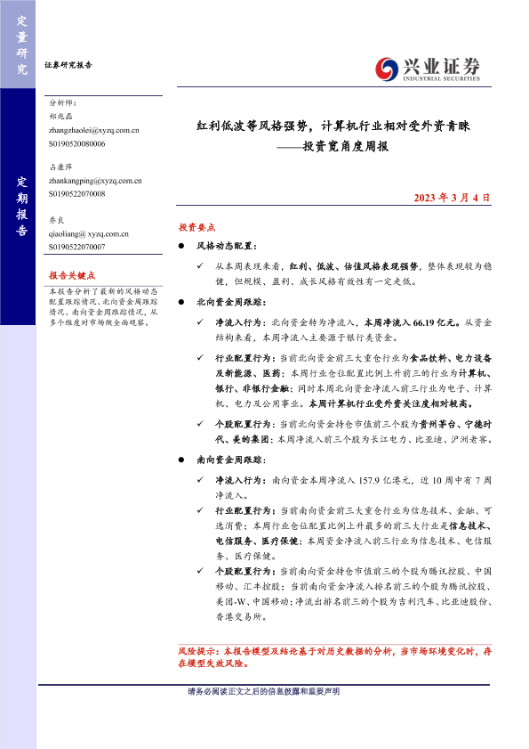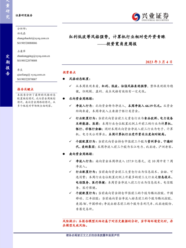 【兴业证券】【20230304】红利低波等风格强势,计算机行业相对受外资青睐 ——投资宽角度周报-15页