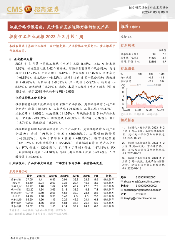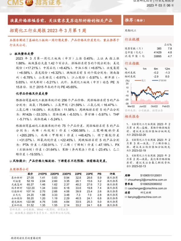 【海通证券】【20230306】招商化工行业周报2023年3月第1周:液氯价格涨幅居前,关注需求复苏边际好转的相关产品-23页