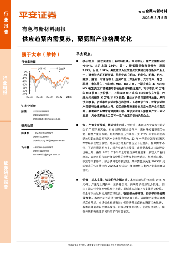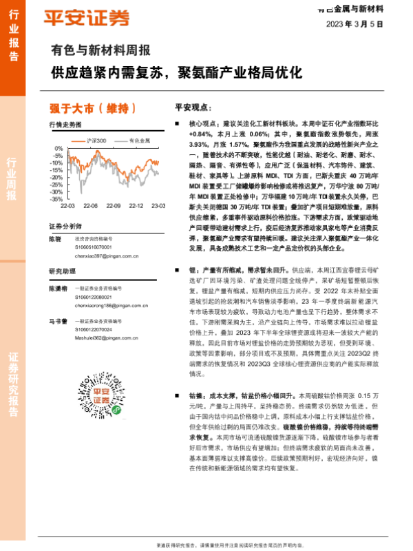 【平安证券】【20230305】有色与新材料行业周报:供应趋紧内需复苏,聚氨酯产业格局优化-16页