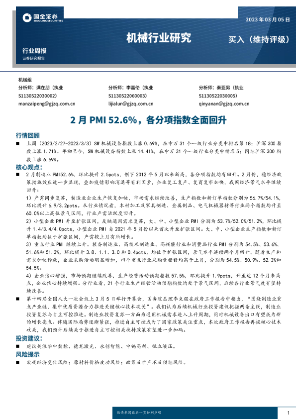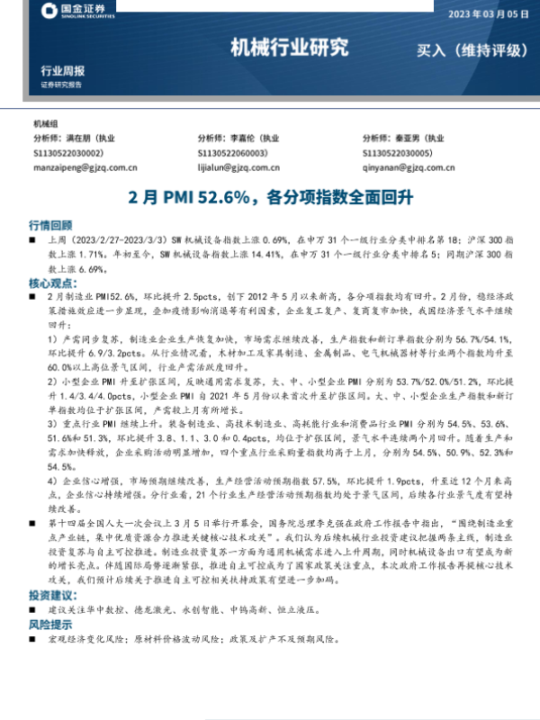 【国金证券】【20230305】机械行业研究周报:2月PMI52.6%,各分项指数全面回升-15页