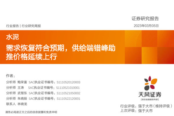 【天风证券】【20230305】水泥行业研究周报:需求恢复符合预期,供给端错峰助推价格延续上行-23页