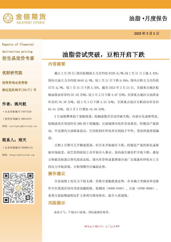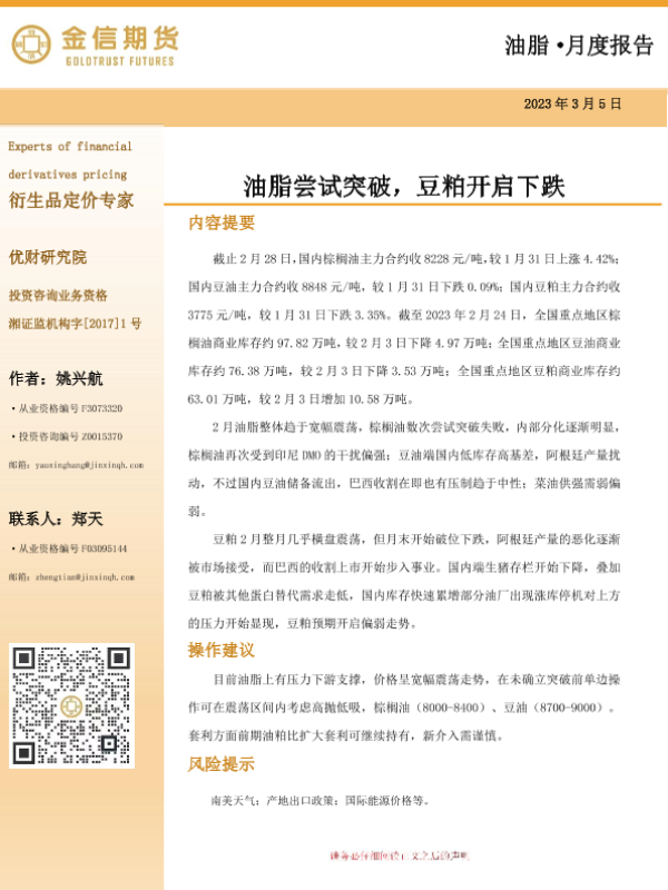【金信期货】【20230305】油脂·月度报告:油脂尝试突破,豆粕开启下跌-22页