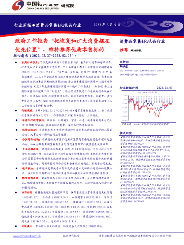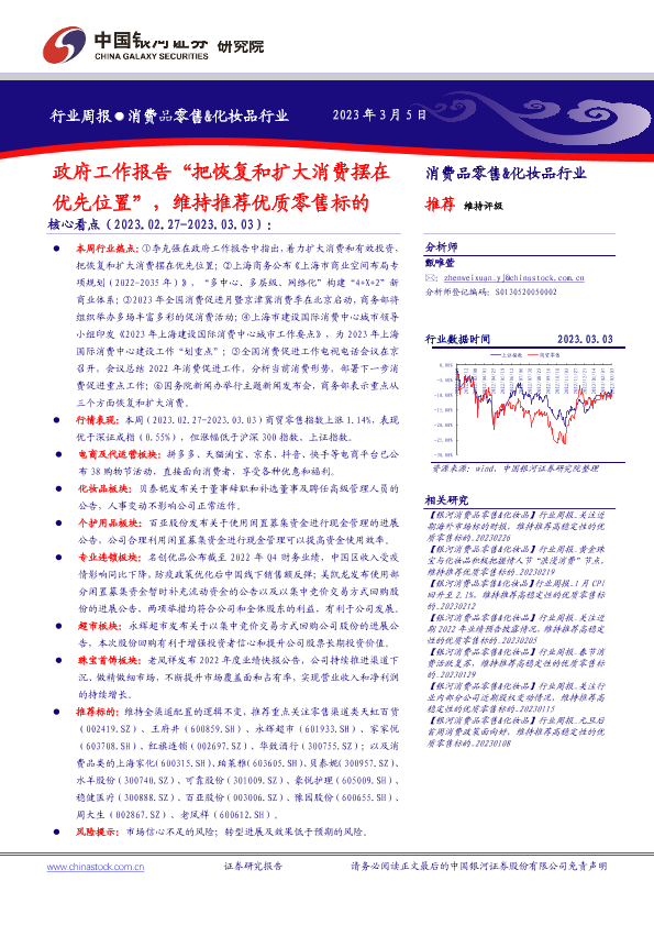 【银河证券】【20230305】消费品零售&化妆品行业:政府工作报告“把恢复和扩大消费摆在优先位置”,维持推荐优质零售标的-34页