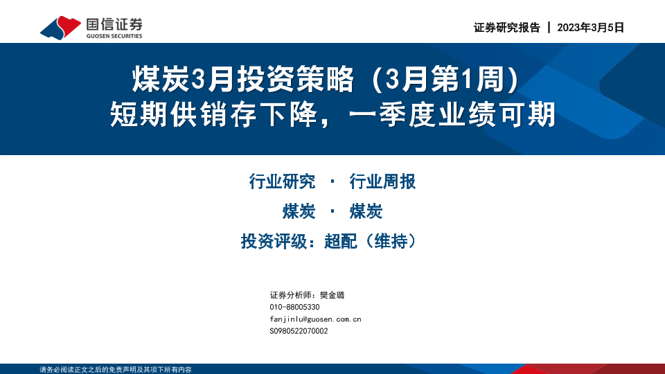 【国信证券】【20230305】煤炭3月投资策略(3月第1周):短期供销存下降,一季度业绩可期-33页