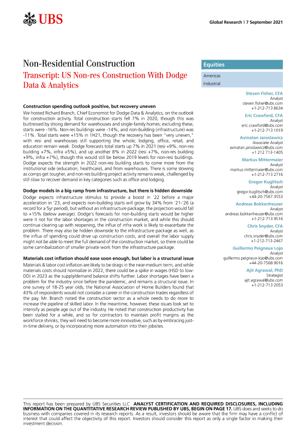 【瑞银 (UBS)】【20210907】瑞银-美股非住宅建筑行业-美国非住宅建设与道奇数据分析-24页