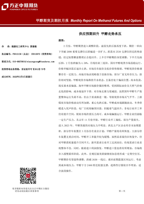 【方正中期期货】【20230305】甲醇期货及期权月报:供应预期回升,甲醇走势承压-22页