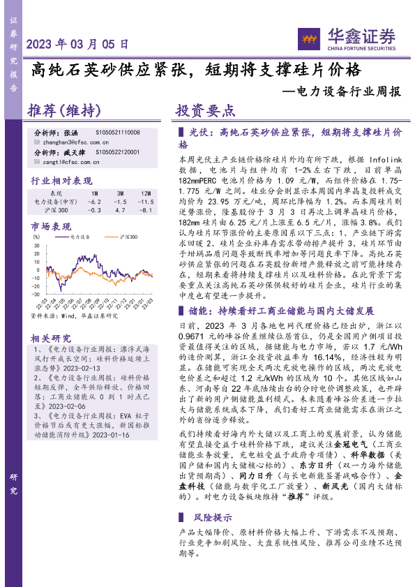 【华鑫证券】【20230305】电力设备行业周报:高纯石英砂供应紧张,短期将支撑硅片价格-17页