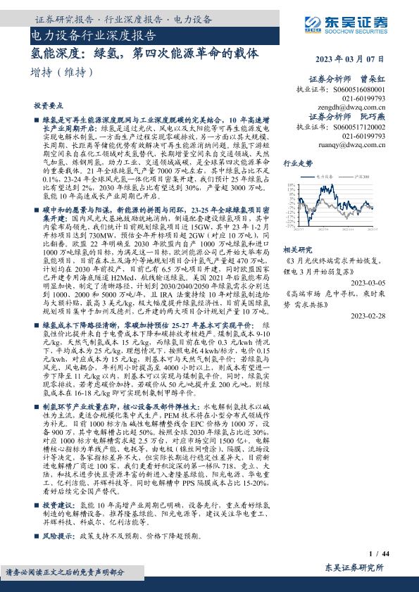 【东吴证券】【20230307】电力设备行业深度报告:氢能深度,绿氢,第四次能源革命的载体-44页