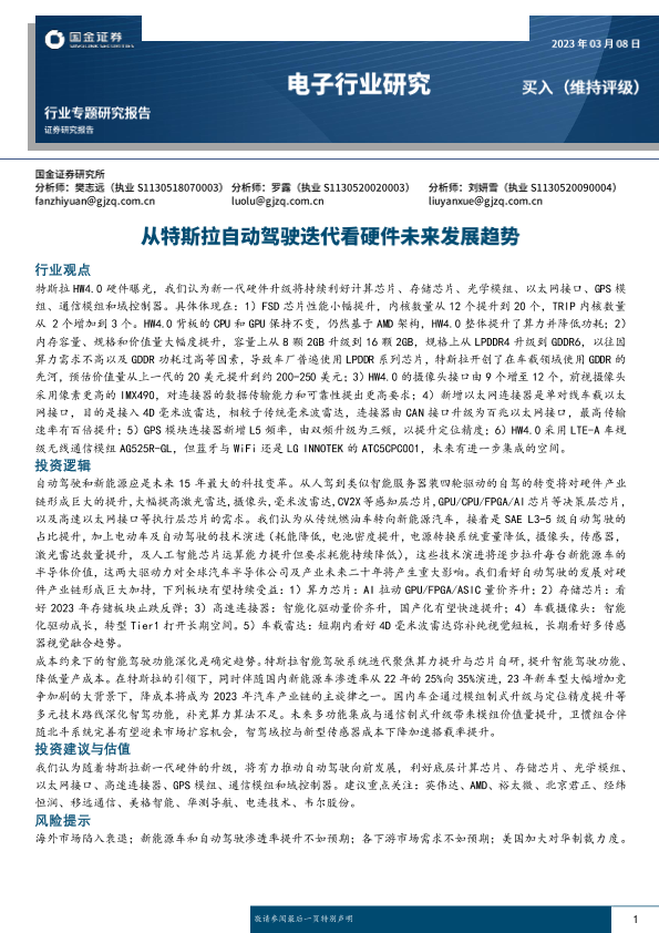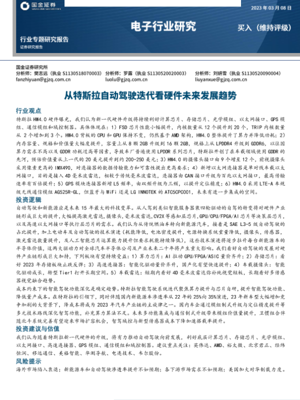 【国金证券】【20230308】电子行业专题研究报告:从特斯拉自动驾驶迭代看硬件未来发展趋势-26页