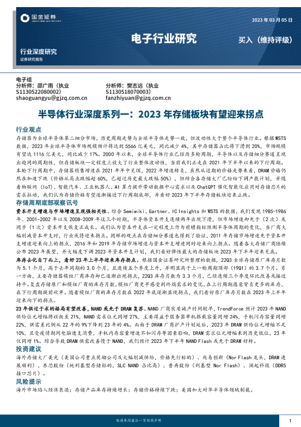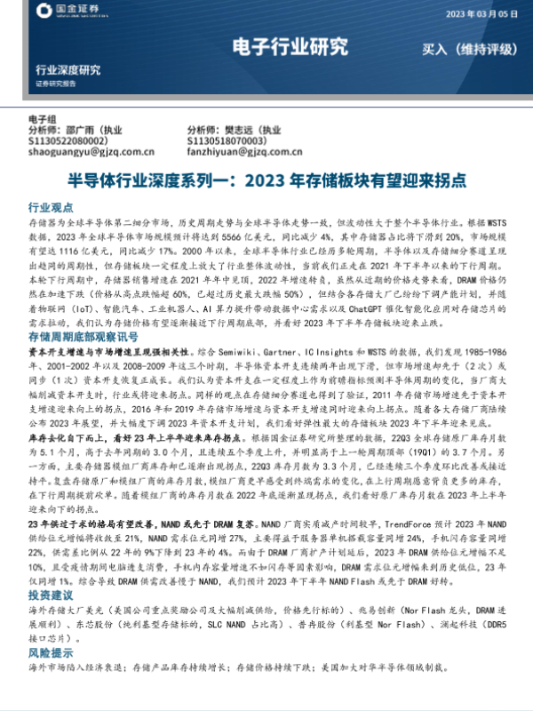 【国金证券】【20230305】电子行业深度研究:半导体行业深度系列一,2023年存储板块有望迎来拐点-20页