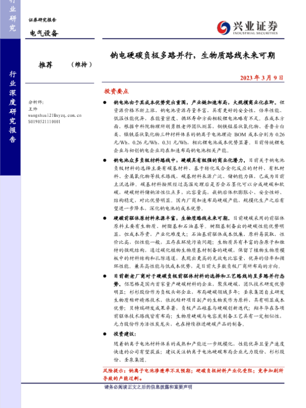 商业化潜力 成本优势 生物质路线 硬碳负极 钠电池