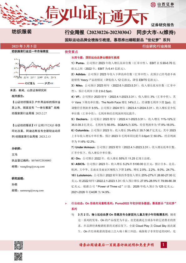 【山西证券】【20230305】纺织服装行业周报:国际运动品牌业绩指引梳理,慕思推出睡眠新品“世纪梦”系列-23页
