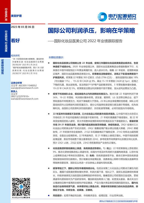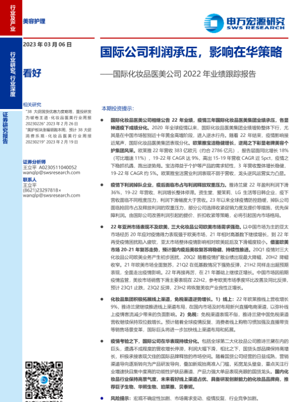 【申万宏源】【20230306】美容护理行业国际化妆品医美公司2022年业绩跟踪报告:国际公司利润承压,影响在华策略-23页