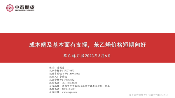 【中泰期货】【20230306】苯乙烯月报:成本端及基本面有支撑,苯乙烯价格短期向好-17页