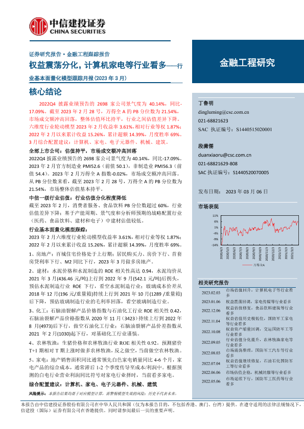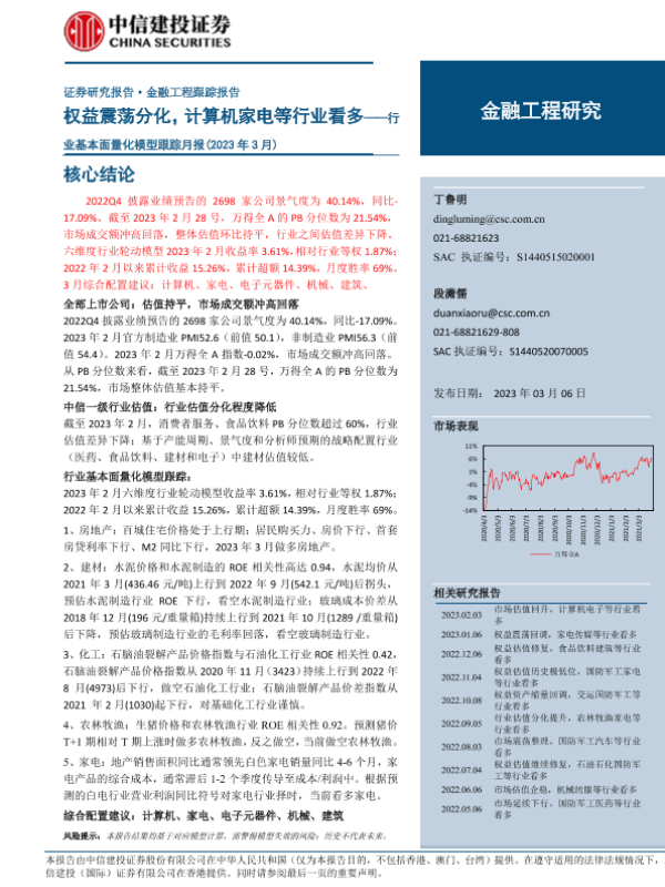 【中信建投证券】【20230306】行业基本面量化模型跟踪月报(2023年3月):权益震荡分化,计算机家电等行业看多-21页