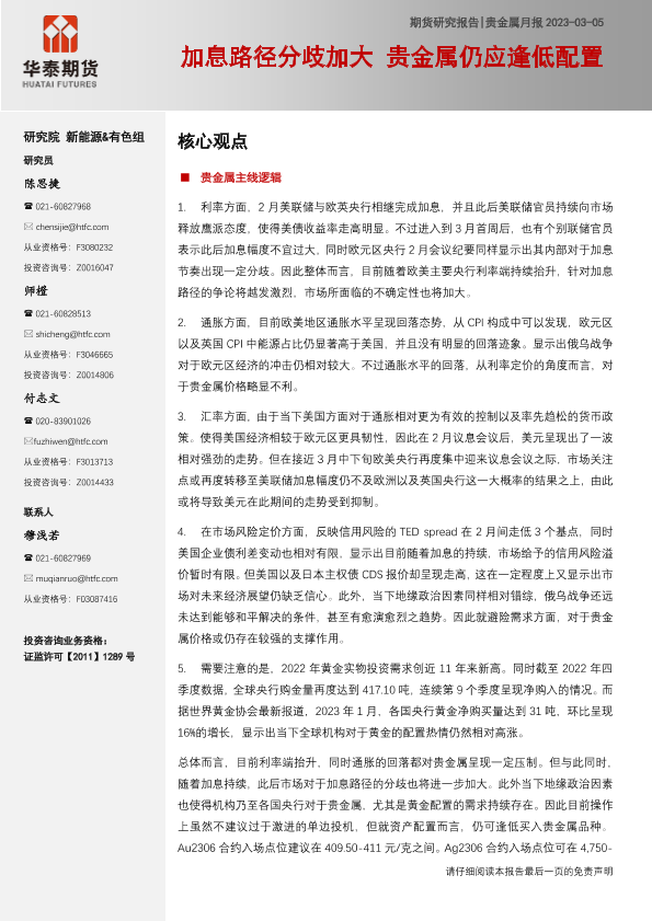 【华泰期货】【20230305】贵金属月报:加息路径分歧加大,贵金属仍应逢低配置-18页