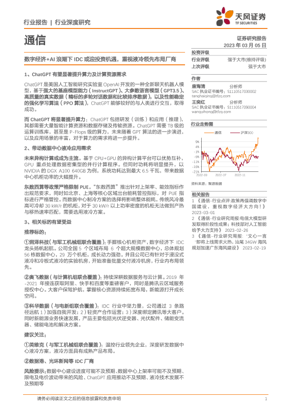 【天风证券】【20230305】通信行业深度研究:数字经济+AI浪潮下IDC或迎投资机遇,重视液冷领先布局厂商-27页