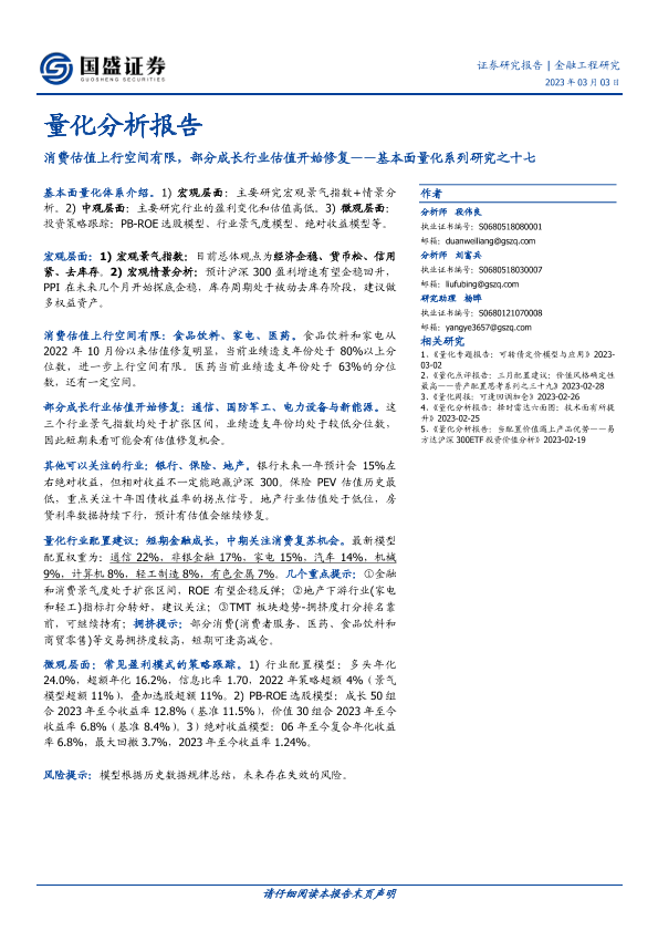 【国盛证券】【20230303】量化分析报告:基本面量化系列研究之十七-消费估值上行空间有限,部分成长行业估值开始修复-18页