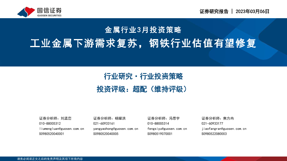 【国信证券】【20230306】金属行业3月投资策略:工业金属下游需求复苏,钢铁行业估值有望修复-40页