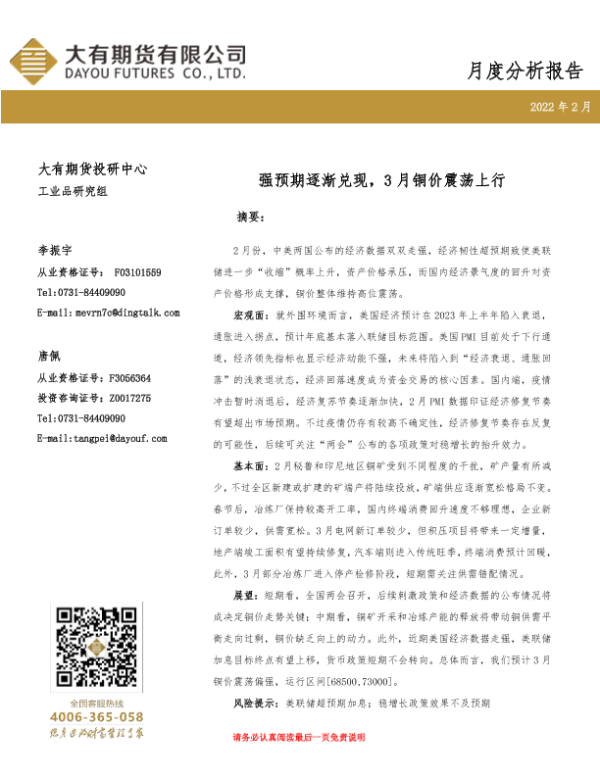 【大有期货】【20230228】铜月度分析报告:强预期逐渐兑现,3月铜价震荡上行-15页