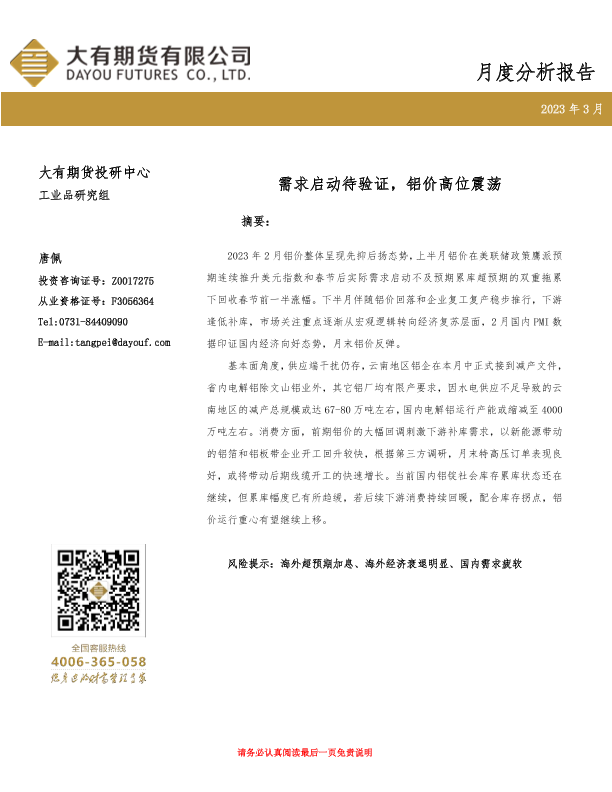 【大有期货】【20230303】铝月度分析报告:需求启动待验证,铝价高位震荡-16页